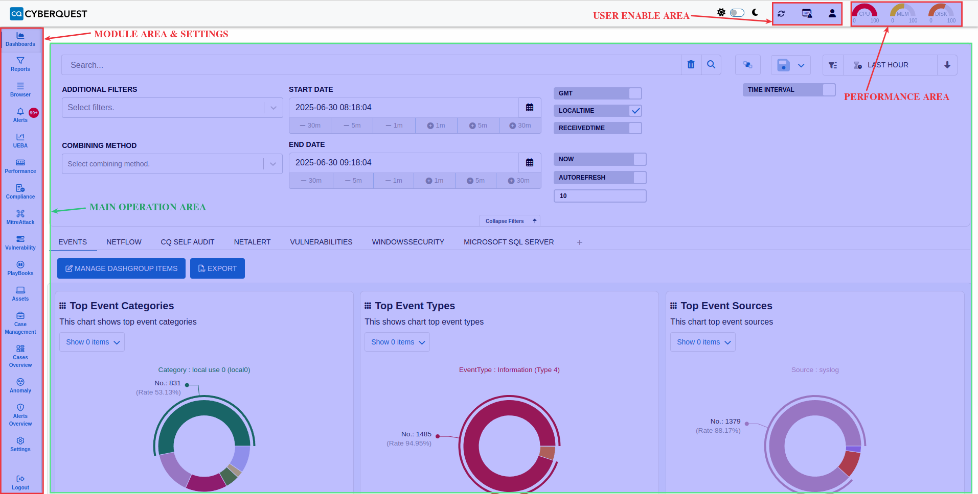 Once authenticated, CYBERQUEST Web Interface will open. By default, Dashboards module is displayed. Depending on each user's access permissions, the interface may differ. Below we are describing user experience and interface functionalities when authenticating as an administrator.