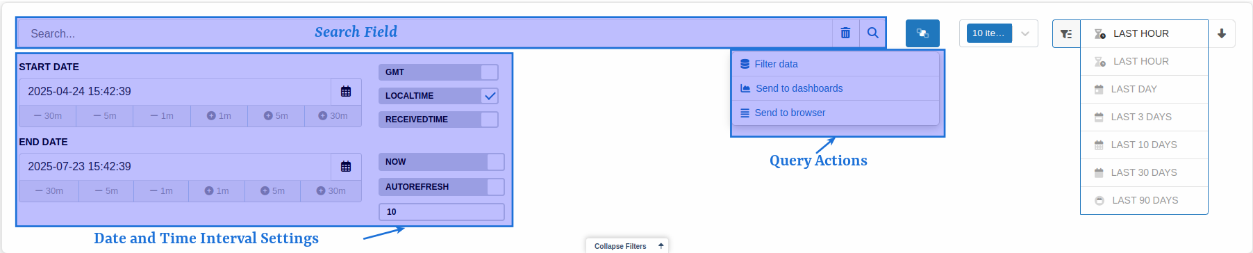- Send to Dashboards - Opens the filtered results in the Dashboards module in a new browser tab.