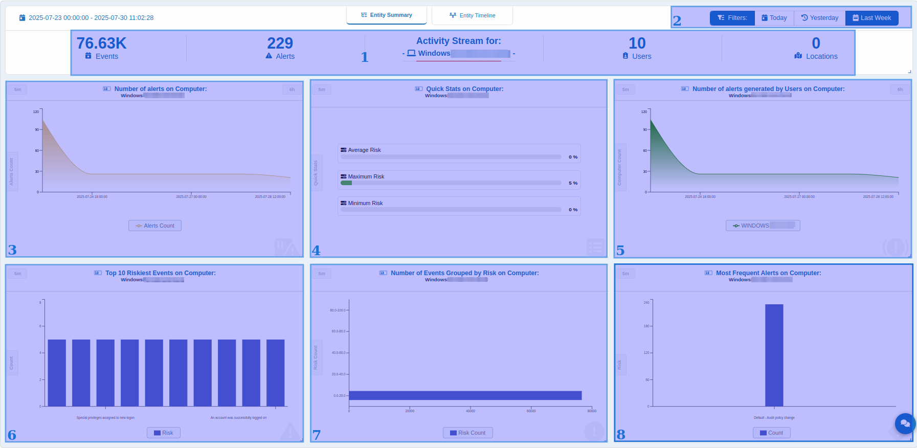 1 - Displays the count of events, alerts, users, and locations associated with the selected computer during the specified time range.