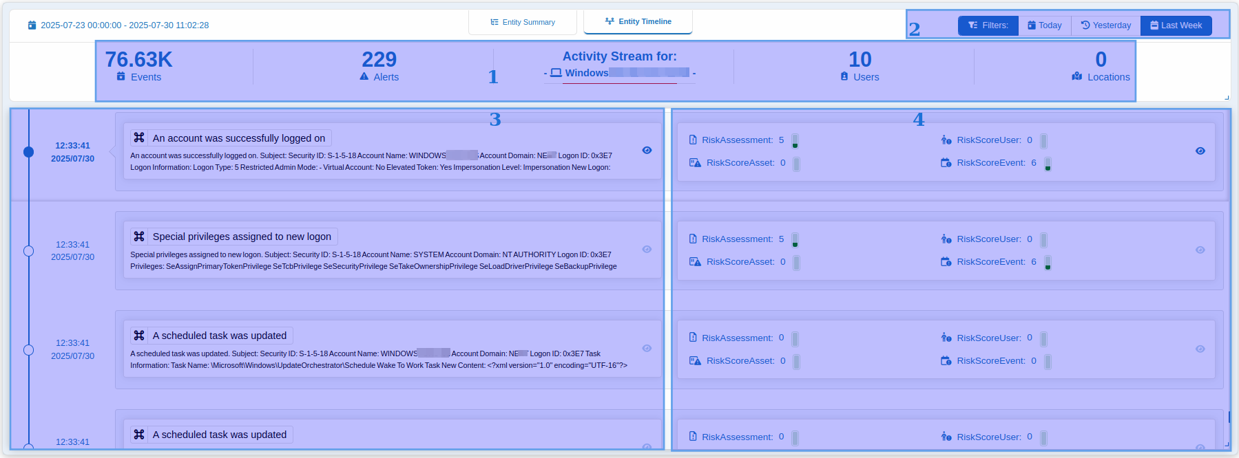 The Entity Timeline provides a chronological view of all notable activities performed by or associated with the selected user. This stream aggregates and visualizes event data such as logons, access attempts, triggered alerts, risk changes, and interactions with different systems or assets.
