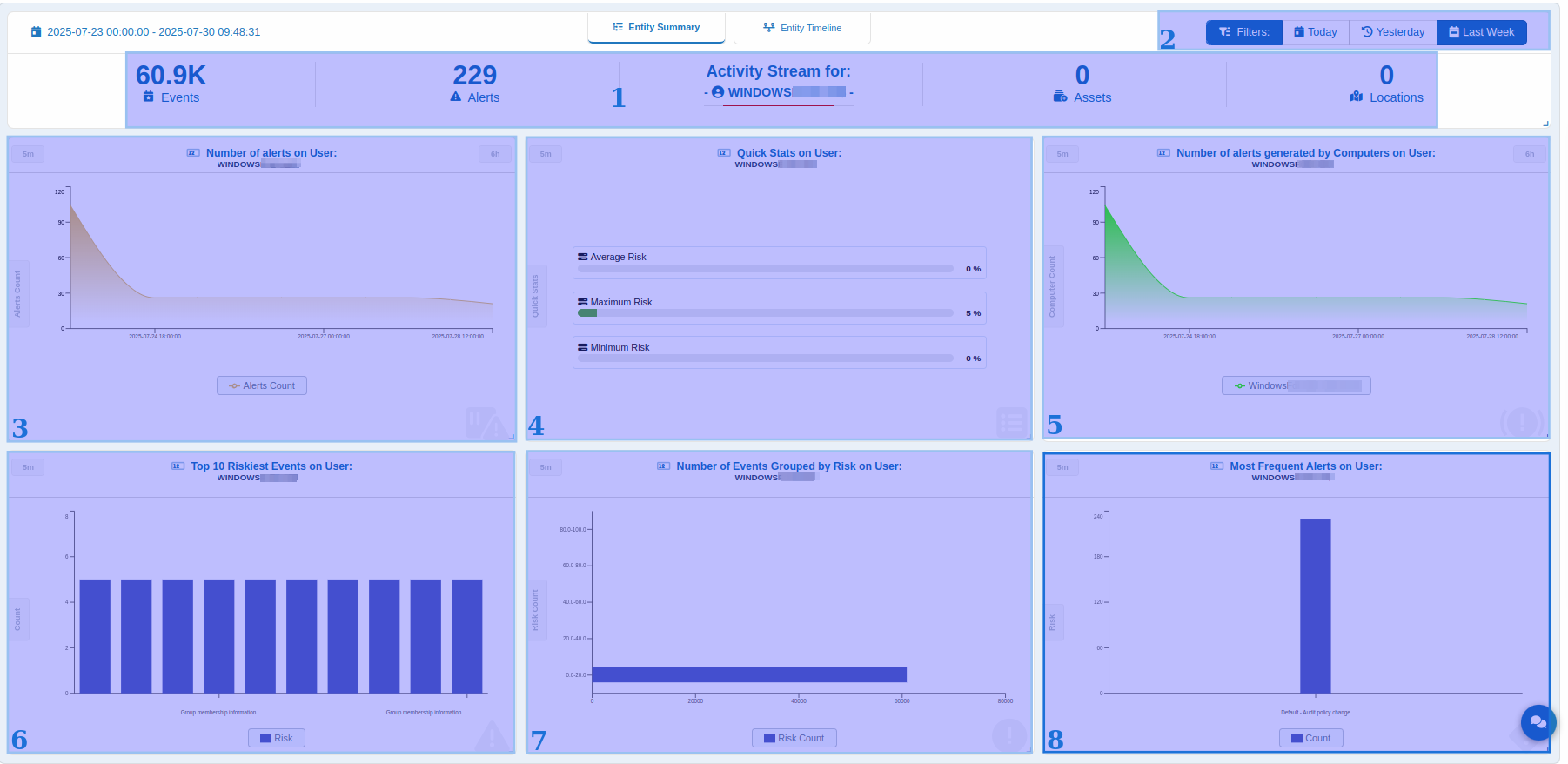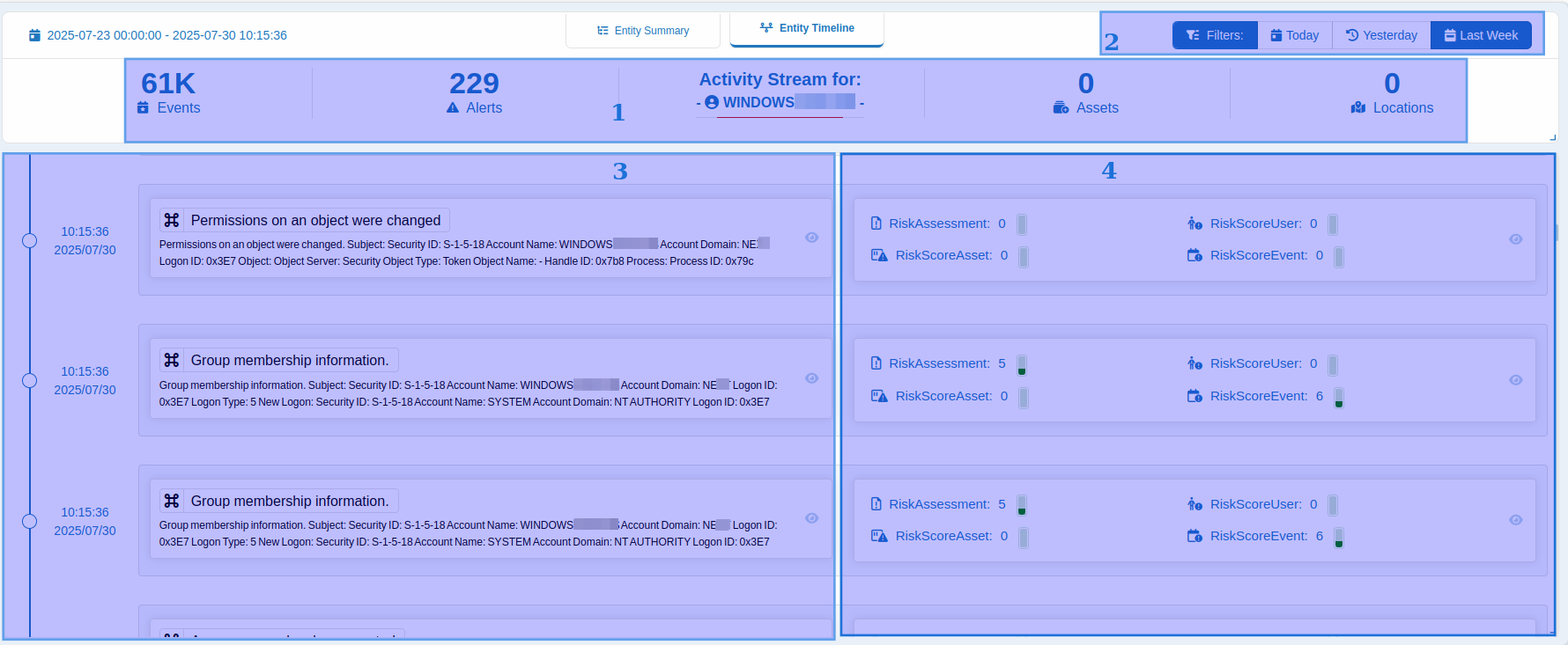 1 - User-Linked Entities Overview Displays the total number of events, alerts, assets, and locations associated with the selected user during the specified time frame.