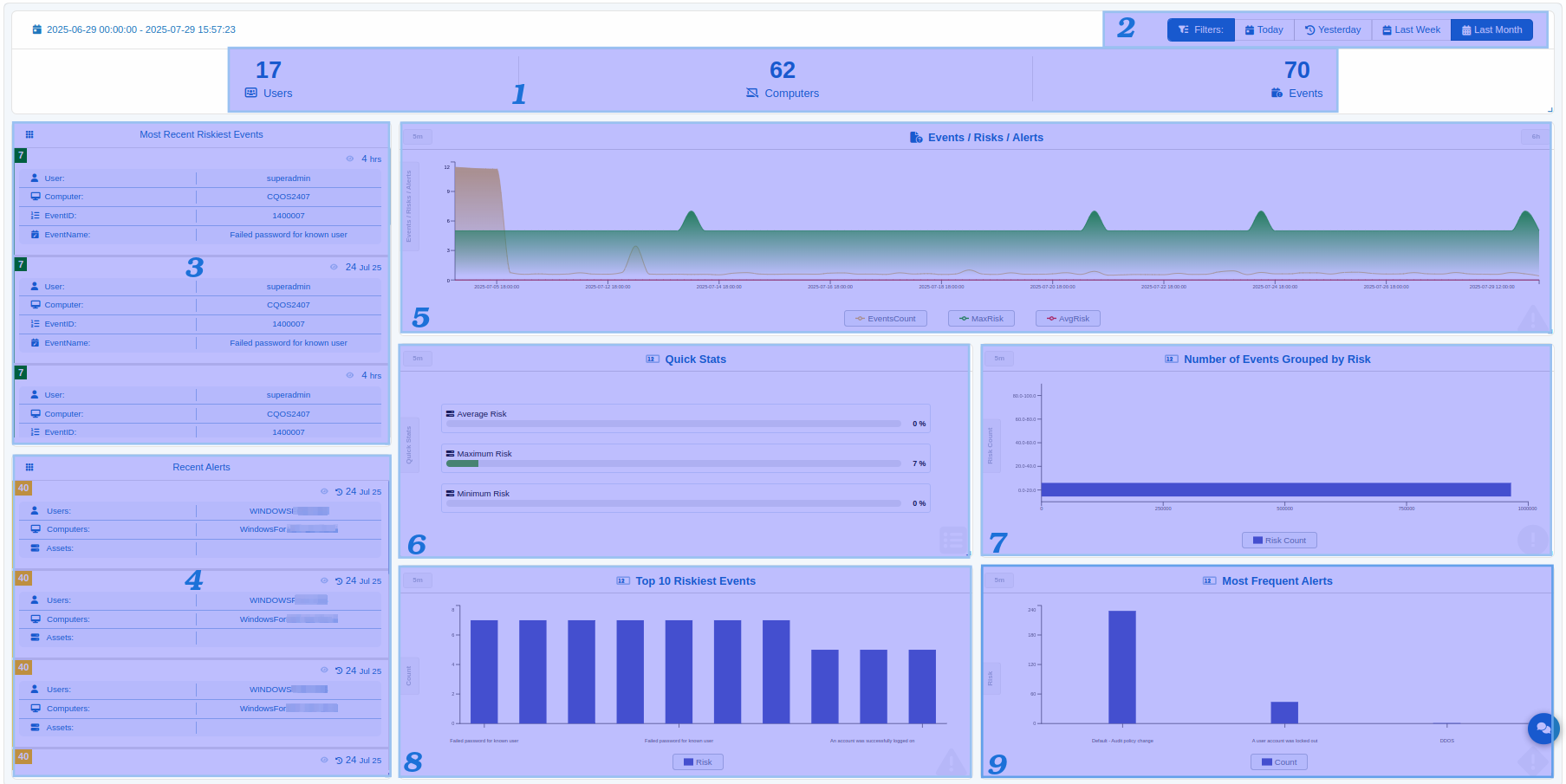 5 - The Events / Risks / Alerts chart displays the number of events, along with the maximum and average risk levels identified during the selected time interval, presented in sample data points.
