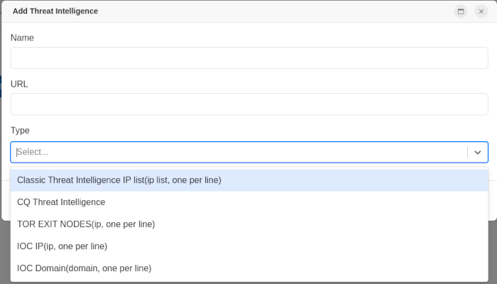 button, which opens the configuration window for defining a new threat intelligence feed. This interface supports multiple threat intelligence formats to accommodate various sources and requirements.