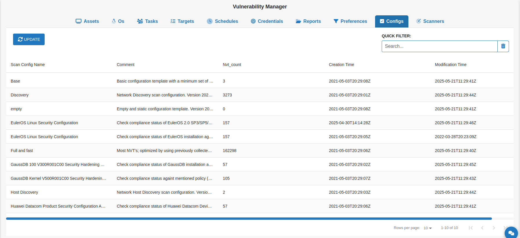 The Configs section provides access to scan configuration settings that define how vulnerability assessments are executed.