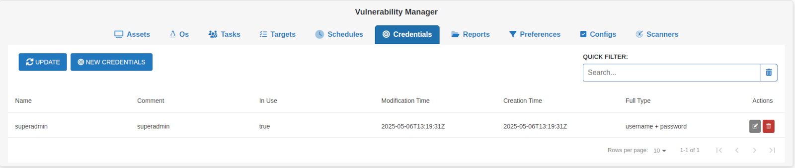 The Update button reloads the Credentials configuration page to show the most recent data.