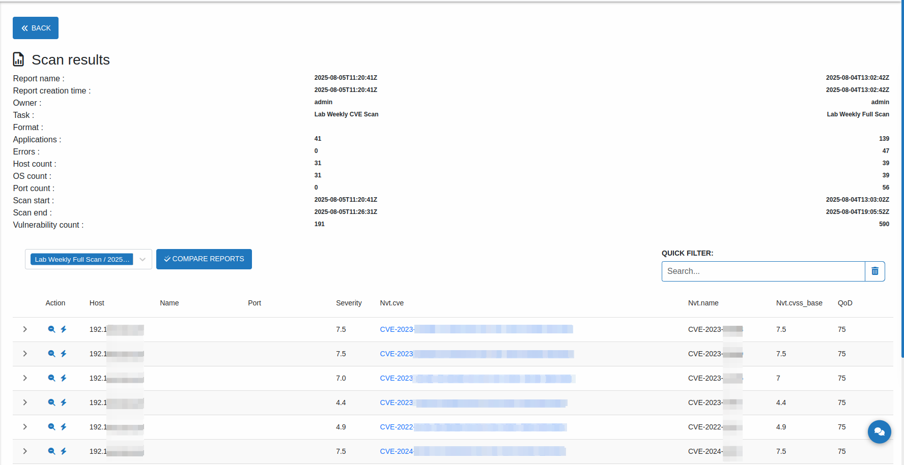 button opens the scan results in XML format. This view allows reviewing detailed scan outcomes and provides the option to compare reports for analysis and validation.