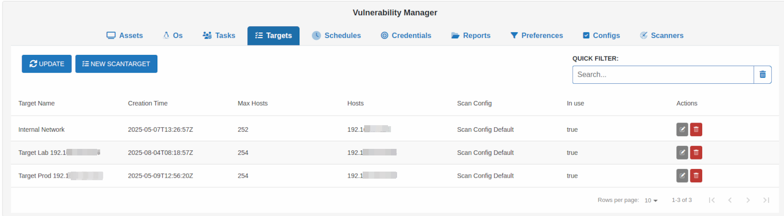 - Edit targets: Modify existing target configurations by clicking the edit icon.