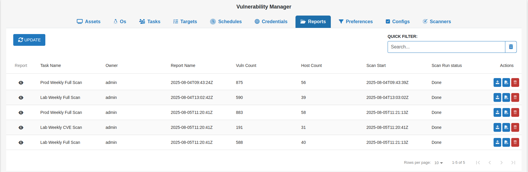 The Reports section presents the results of completed scanning tasks, displaying key information like as the report name, associated task, owner, number of detected vulnerabilities, number of scanned hosts, scan start time, current scan status, and available actions.
