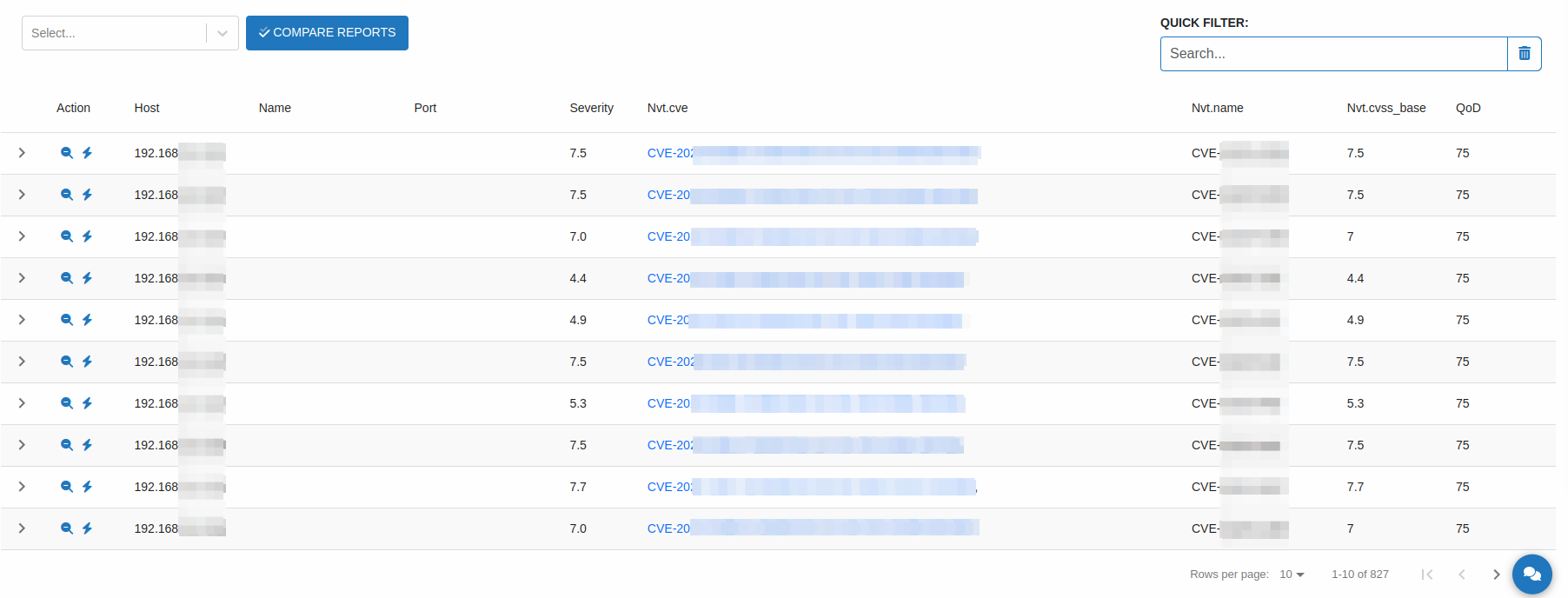 The table displays detailed information about vulnerabilities categorized by ports, hosts, severity, NVT (Network Vulnerability Tests), name, NVT.CVE (Common Vulnerabilities and Exposures), and QoD (Quality of Detection).