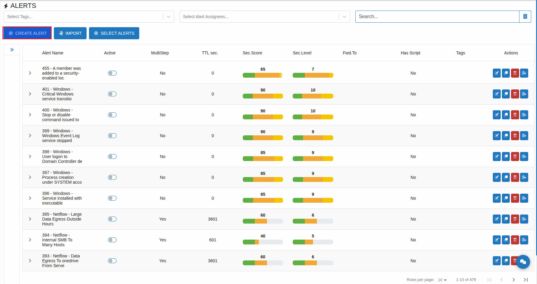 Under Rules section, you can granularly define rules controlling the alert behaviour. You can define from single event rules to any correlation between events, order in which events occur, correlation to missing an event from a logical succession of events and so on.