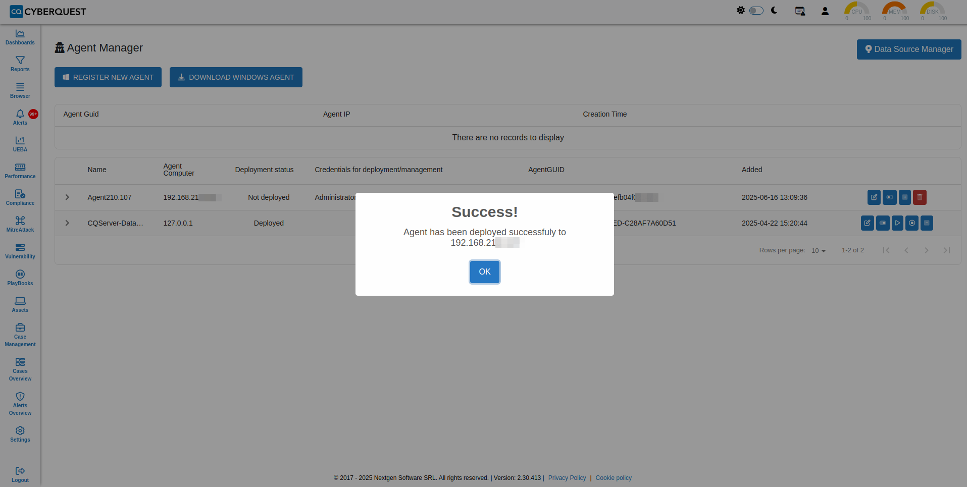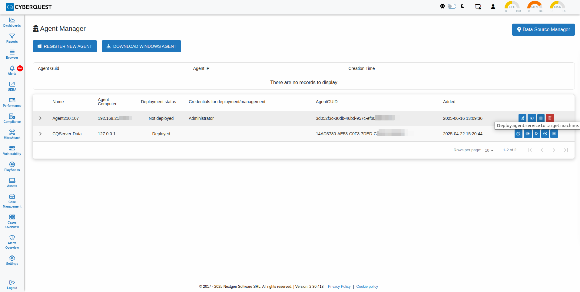 Download windows agent - download the latest version of the CYBERQUEST agent. The agent must be installed on a Windows target machine and the file will be downloaded as “AgentSetup.msi”.