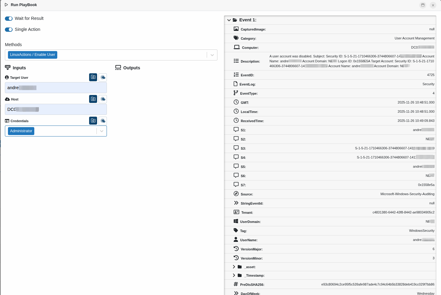 The playbook runs for that specific event, allowing targeted mitigation without waiting for automatic triggers.