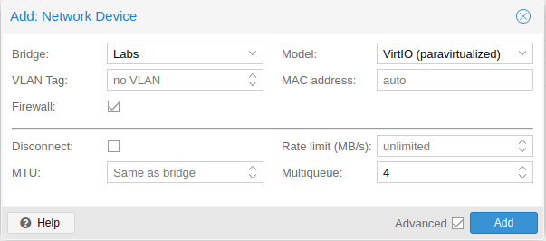 - Configure the network settings, including bridge, MAC address, model, and VLAN (if applicable).
